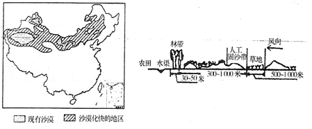 (4)图中显示的固沙措施有①_____________________,②_____________________。具体而言,我国为防止这一地区沙漠的南移已营造了“三北”防护林带,该防护林带的生态效益是_____________________。(3分)