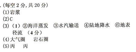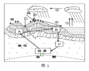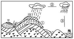 本题解析:本题考查地质构造及水循环。岩层弯曲是受内力作用的结果。根据岩层的弯曲方向或岩层的变位,判断甲表示向斜(中间岩层向下凹);乙表示断层(岩层发生断裂,两侧岩层错位);丙表示背斜(中间岩层向上凸)。
