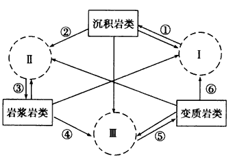 3、单选题 下图为岩石圈物质环示意图,图中I、Ⅱ、Ⅲ分别代表沉积环境、熔融环境和变质环境,箭头线代表不同的地质过程。读图回答1~2题。