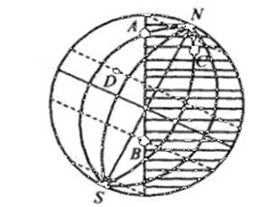 (4)若A点某日昼夜平分,且时刻为14:00,在图中用阴影画出这一时刻夜半球的范围。
