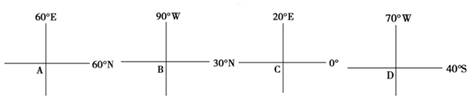 4、单选题 下图为世界四个地点的坐标,作为大洲分界线的经线经过的地点是( )