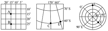 【小题1】第2题CD位于60°S纬线上,60°纬线长是赤道的一半,故CD距离=5(度)*1/2*111KM/度。