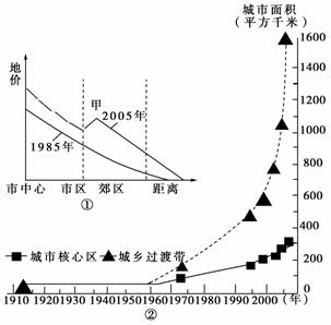 1.①图中甲处最不可能建设2.①图中地价变化的原因和图②代表的国家分别是3.②图反映了该市