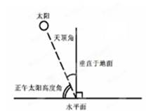 点评:本题组难度较大,对于此类试题,学生应加强题目信息的把握,解答本题组的关键是学生要掌握太阳直射回归运动、季节、及公转速度的变化规律的相关知识。另外太阳天顶角是表示太阳位置的一种方式,如图所示太阳天顶角是天顶与某日太阳的最大高度时的夹角,他与正午太阳高度角互余。