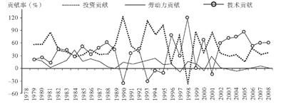 近年来,湖南省经济快速发展,工业水平不断提高。读“1978—2008年投资、劳动力及技术进步 对湖南工业增长的贡献”