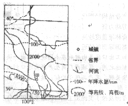 小题2:读图,由图中等降水量线数值可以判断,该地降水较少,自南向北递减,A对。这里是干旱区,降水量在200mm以下,B错。图中数据显示,同纬度南部地区的西部受山地地形影响,降水略多于东部,中北部地区没有地形影响,东部西部降水量相同,C错。影响我国的冬季风主要是西北季风,带来水汽很少,降水少,D错。