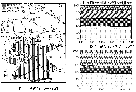 材料一:德国河流和地形图、2001至2011年德国与法国能源消费构成变化图。