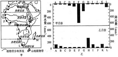 2、综合题 图甲是“非洲大陆植物类型分布示意图”,图乙上下两部分是“非洲西部沿海A—L各地一月份和七月份降水量示意图”,读图回答问题。(12分)