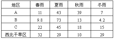 (3)下表是我国各地降水季节分配表(占年总量%),能代表黄土高原某地区的字母是ABC中的_____,