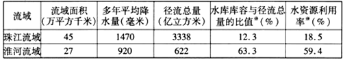 (2)由材料可知,淮河流域的水库库容与径流总量的比值比珠江的高,证明淮河流域水资源的利用率高于珠江流域。
