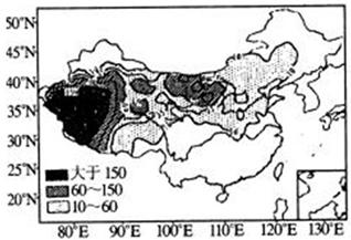 1、综合题 读“中国年平均沙尘天气日数分布图”,分析回答: