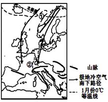 5、综合题 (7分)2012年初,欧洲西部地区遭遇极寒天气,极地冷空气沿大西洋东岸侵袭欧洲西部地区。气象专家认为,极寒天气与北极涛动以及拉尼娜现象有关。读右图完成下列问题。
