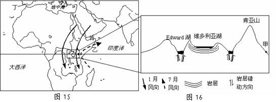 材料二?图15为非洲及周边地区略图,图上标出了1月和7月的风向,图16为非洲东部部分地区的地形和构造剖面示意图。