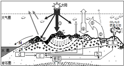 (3)图中④箭头表示 ;当岩浆活动释放出大量气体会导致④作用 (增强或减弱),这一现象体现了地理环境的 性。
