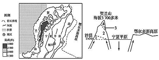 4、单选题 下图为“宁夏北部地形和剖面图”,剖面图中数字代表自然带。读图回答各题。
