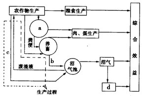 小题1:根据图示:农作物生产产生了粮食,所以a应该为养禽;b为沼气池的原料,为粪便;c为秸秆,d为发电。所以本题选择D选项。