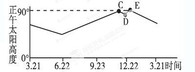 【小题2】在C→D→E这段时间内,太阳直射点的移动方向为( )