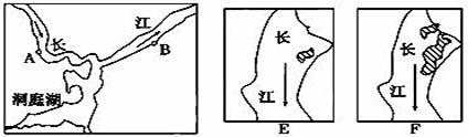 本题解析:图中沙洲的形成主要与曲流有关(凸岸沉积凹岸侵蚀);从沙洲出露水面的面积可知,E表示夏季丰水期,F表示冬季枯水期。夏季时长江进入汛期,水量大、水位高,长江补给洞庭湖,流量A>B;枯水期时,长江水量少、水位低,洞庭湖补给长江,流量A<B。选项D正确。