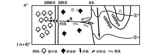 3.由于南赤道暖流减弱(1分),造成太平洋西部海域表层水温比常年低(1分),下沉气流活跃(1分)