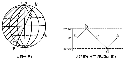 (2)太阳光照图所示这一天是北半球的________日(节气),此时太阳直射点刚好位于太阳直射点回归运动示意图a、b、c、d中的 。这一天,地球处在公转轨道靠近 (近日点、远日点)位置上,公转速度 (较快、较慢)。