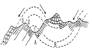 本题考查地质构造的判断。背斜岩层向上拱起,向斜岩层向下弯曲。所以A为背斜,B为向斜。背斜中间岩层老,①处岩层老,背斜顶部受到张力被侵蚀成谷地;向斜槽部受挤压岩性坚硬不易被侵蚀反而成山岭。背斜适合修建隧道。所以本题选择C选项。