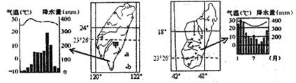 5、单选题 该图是台湾岛(甲岛)和马达加斯加岛(乙岛)及其部分区域气候图。读图回答问题。