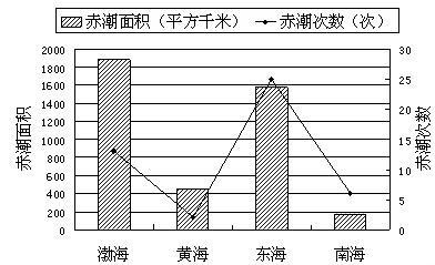 (2)2013年赤潮发生次数最多的是______海;受灾面积最广的是______海。分析渤海赤潮灾害严重的原因。(10分)