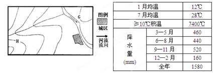 小题1:根据图中有一条河流,由于河流位于地势比较低的地方,故可以得出G点得海拔为100M,H点得海拔为300米,从H点看G点的时候,由于H点位于山脊上,阻挡不了视线,故A错,依据气候资料也可以判断出该地是亚热带季风气候,该地河段主要雨水补给,故答案为D;