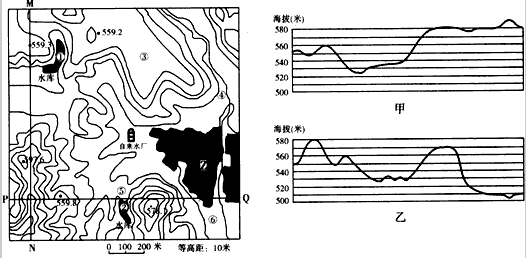 4、单选题 ? 下图是某地地形图,MN、PQ是地形剖面线。①②是水库,若从中选择一个作为自来水厂的水源地,其条件是自流引水且工程建设费用最小。完成1—2题。
