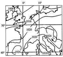 2、单选题 下图为“1月某日欧洲西部部分地区海平面等压线分布图(单位:hap)”。读图完成下列各题。?