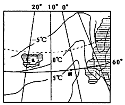 3、单选题 读某地一月平均气温分布图(阴影部分为陆地),回答下列各题。