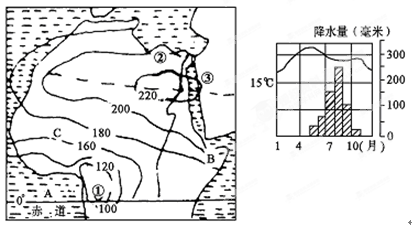 1、综合题 (8分)读非洲局部地区太阳辐射量等值线图和C地气候资料图,回答下列问题。