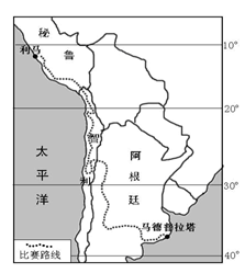 小题1:根据图示的赛程位于南美洲10°S~40°S的大陆西岸,主要属于中低纬度地区,没有冰天雪地的险境,也没有经过热带雨林气候区,沿途主要是热带沙漠气候,降水量少,没有明显的泥泞沼泽地。
