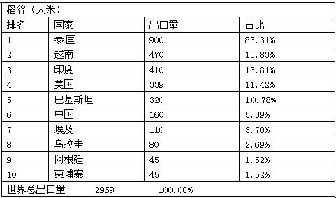 材料一:我国稻米进出口量不到国内供求总量的0.5%。大米出口中,85%以上为中低质早籼米,主要出口到一些经济不发达、粮食短缺的亚洲和非洲等发展中国家。进口稻米的消费地区主要是大城市和沿海发达地区,我国稻米进口来源国家和地区比较单一,主要是泰国。近几年从泰国进口的稻米占我国稻米总进口的比重一直在99%以上,主要是进口香米等高质量稻米,以满足国内高收入阶层的需要。