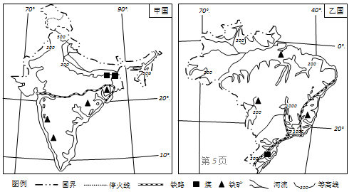 (1)读图,根据海陆轮廓和经纬度可以判断,甲国是印度,乙国是巴西。印度北部有恒河平原,南部有德干高原。巴西北部是亚马孙平原,南部是巴西高原。所以两国地形的共同特征是以高原和平原为主,高原位于南部,平原位于北部。
