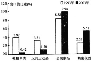 材料二:下图为“台湾1993年和2003年部分出口产品所占比重统计图”