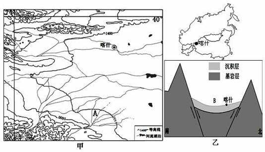 材料二?甲、乙两图为喀什所在区域图和地质剖面图。