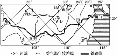 本题解析:(1)结合我国南北铁路干线回答。(2)主要体现在加强重庆和东部地区、西北地区的经济联系,强化枢纽地位,促进经济发展。(3)A是成都,B是武汉,从地形对气候的影响方面进行分析。(4)C河段是荆江,主要体现在河道弯曲,形成地上河,洪涝灾害严重。D湖是洞庭湖,面积缩小的原因从泥沙沉积、围湖造田两方面考虑。(5)E地位于江南丘陵地区,结合教材回答。