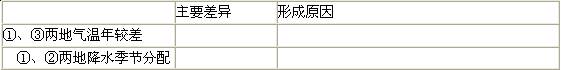 (4)读图2,列表比较①②③三地气温和降水的主要差异及其原因。(6分)
