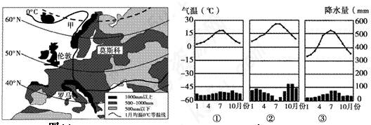 图1为欧洲年降水量和一月均温0°C等温线分布图,图2为①②③三地气温曲线和降水量柱状图。