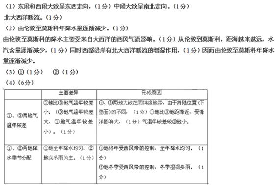 (2)说明图1中从伦敦至莫斯科年降水量的变化特点,试分析成因。(4分)