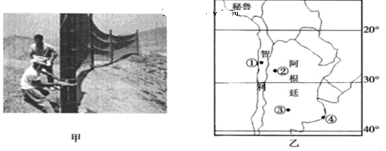 2、单选题 下图中甲中为一张长12米、宽4米的大网,网的下方有水槽可以把网上流下的水引向一个蓄水池。图乙为南美洲部分国家图,读图回答问题。