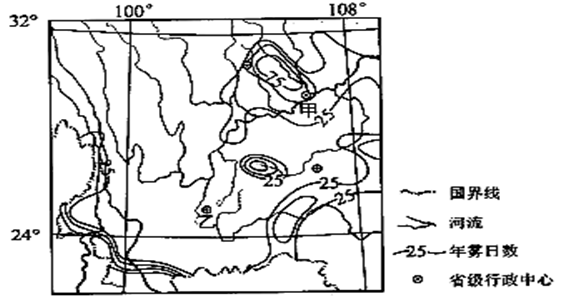 【小题1】据图可知:该区域西南部为我国的横断山区,这里山河相间,导致年雾日数等值线密集并且沿地形呈西北—东南方向分布,所以本题D正确。