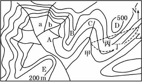 (4)建公路要利用有利的地形地势,充分考虑路线的长短与坡度,图中从甲村到乙村经丙地公路线长度虽短一些,但坡度较经丁地陡,工程量大,故应选择经丁处线路施工容易。