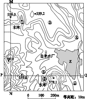 2、综合题 (10分)下图是我国某地地形图,甲、乙两图是沿MN、PQ所作的地形剖面线。①②是水库,为了Z村的发展,该地新建了一座自来水厂。读图,回答下列问题。