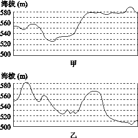 (1)从上图地形图可以看出,MN的剖面线经过的海拔要更高,而PQ的剖面线经过的海拔要更低,从两幅剖面图可以看出,甲图出现的海拔要比乙图出现的海拔更高,MN的剖面线的海拔要高于PQ。
