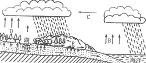 (1)本题考查水循环。水循环可分为海陆间循环、海上内循环、陆上内循环。水循环的主要环节有:蒸发、降水、水汽输送、地表径流、下渗、地下径流、植物蒸腾等。图中A是降水、B是蒸发、C是水汽输送、D是植物蒸腾、E是地表径流、F是地下径流。