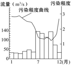 人类生产生活中的废水,不加处理,任意排放,常造成严重的水质污染,从而破坏了水体环境。下图是黄河中游某支流一水文站流量和污染程度的实测结果,读图回答下列问题。