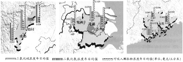 2、综合题 下图为"成都平原、太湖平原、珠江三角洲地级市空气污染综合指标对比图",读图回答下列问题