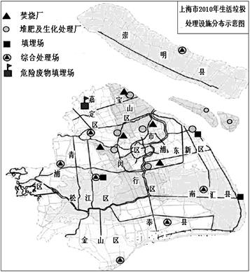 5、综合题 垃圾围城是全球都市发展中面临的一个突出问题。阅读2010年上海市生活垃圾处理设施分布示意图,完成下列要求。(10分)